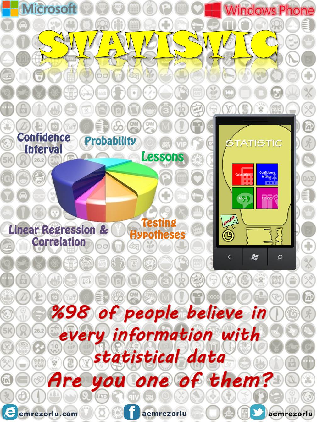 Statistic calculates and teaches all kind of statistic terms and lessons. With this app you can calculate variances, standard deviations, confidence intervals, quartiles, modes, medians, averages, ranges.